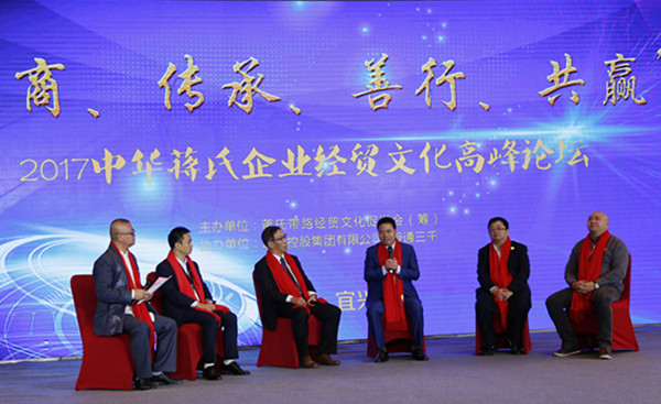 圆桌论坛环节,蒋锡培与国家一级美术师蒋义海、上海仰岳投资管理有限公司董事民主建国会会员蒋培德,四川大学教授、企业战略商业模式专家蒋昌明,蒋氏“一带一路”经贸文化促进会(筹)会长蒋利民,湖南登浩宇建材有限公司董事长蒋朝辉围绕“兴商、传承、善行、共赢”主题进行了精彩的解读。