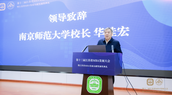 南京师范大学校长华桂宏教授首先致开幕辞。近年来,南师大引进了25个不同领域的国家级人才,并在人才引进与培养、社会服务、国际合作、学科建设等方面取得了显著进展。江苏省MBA企业家联谊会2008年成立,而南京师范大学也正是从2008年开始筹建MBA项目,致力于培养具有深度责任感、具有创新精神的全球商业人才。经过十五年的发展,南师大MBA教育凭借百年文化底蕴和经济管理学院的雄厚实力,追赶学术前沿、服务社会发展,以教育为中心,精心打造品牌。持续为公检法、税务系统和企事业单位培养了一大批具有使命意识、全程视野、创新思维的高层次人才,得到了社会各界的肯定,成为学校服务社会、开放办学的重要体现。此次大会对于促进南师大人才培养经验分享、岗位教育以及教育高质量发展具有非常重要的意义。同时,也为江苏的商科教育发展构建新蓝图、树立新范式。