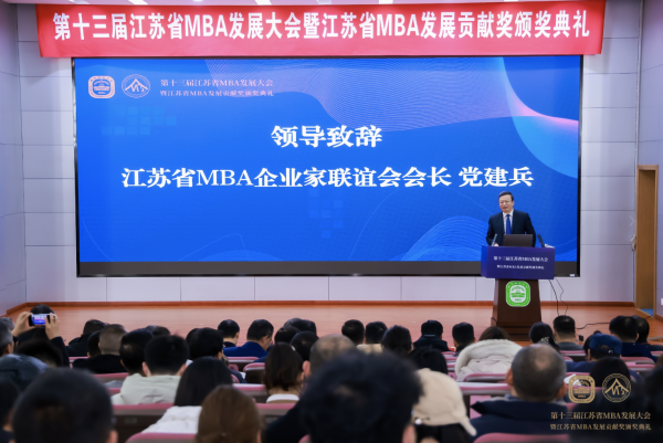 江苏省MBA企业家联谊会会长、久吾高科董事长党建兵发表致辞。党会长介绍了 MBA 企业家联谊会的成立与发展情况,分享对于未来商科教育的看法和体会。他认为,商科教育需要把握经济前端,捕捉经济发展的变化与方向,争取通过每年一次的MBA发展大会活动,为广大MBA以及社会人士带来最前沿的经济视角,努力提升MBA在江苏经济发展中的地位。党建兵还分享了自己所在的久吾高科公司招聘情况和人才培养情况,作为“江苏优秀企业”和与南京工业大学双牵头的制造业创新中心,久吾高科近年来输送、培养了十多名 MBA。