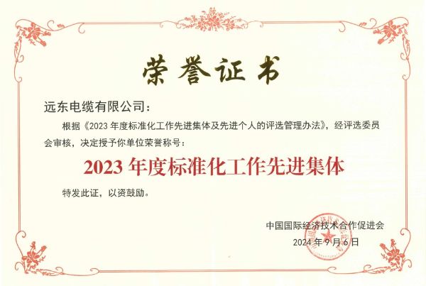 作为全球线缆行业的领跑者,远东电缆在推动产品技术革新的同时,也深化了其在管理标准化领域的知识沉淀,荣膺“2023年标准化工作先进集体”。多年来,远东电缆在主持标准建设,国、行、企标准起草,国际标准布局,人才培养上均取得了瞩目的成绩: