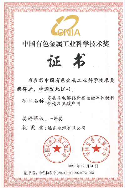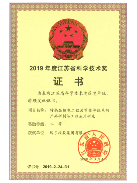 凭借强大的科研能力、技术水平和较好的社会经济效益,远东电缆节能导线产品/技术还先后被授予中国专利优秀奖、江苏省科学技术奖、中国有色金属工业科学技术一等奖等多个奖项。